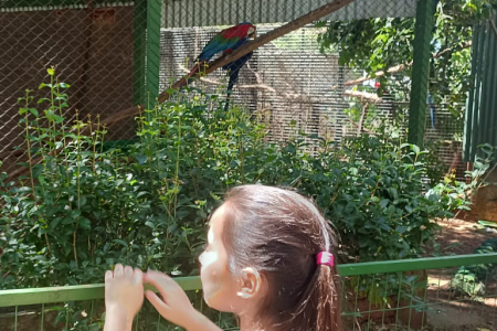 A primeira parada foi no Primaves, onde puderam conhecer diferentes animais silvestres resgatados de maus-tratos. Durante a visita, a guia explicou sobre a alimentação e os cuidados necessários com cada espécie, promovendo reflexões sobre a importância da preservação e do respeito aos animais.
