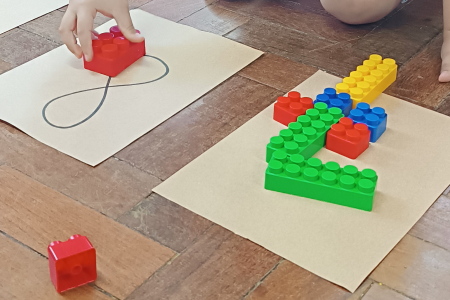 Durante a atividade, os alunos foram convidados a montar pequenas estruturas com Lego, observando cores, formatos e, principalmente, quantidades. Após as construções, cada criança registrou o número de peças utilizadas, exercitando a contagem, a atenção e a organização do pensamento lógico de forma natural e divertida.